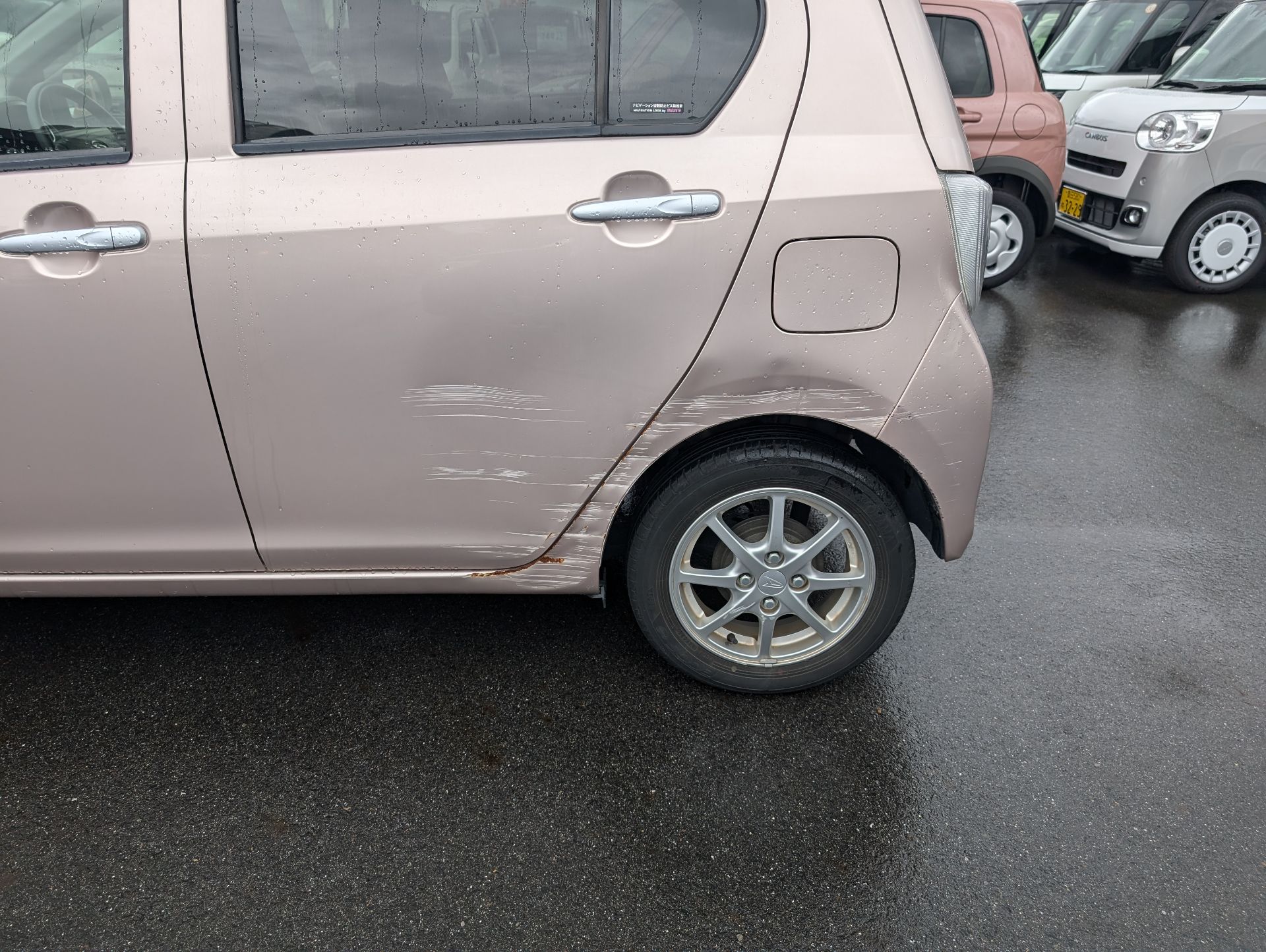 助手席側のリアドア周辺に大きな傷がございます。